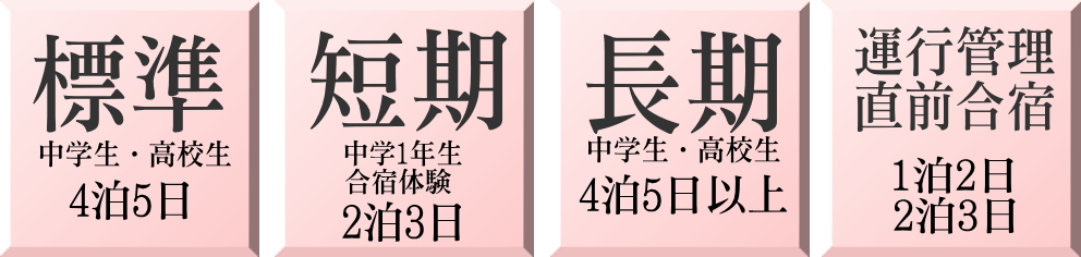 中学生の合宿日程は4泊5日を標準の日程として目的と状況に応じて2泊3日の短期と4泊5日以上の長期日程が選択可能です。