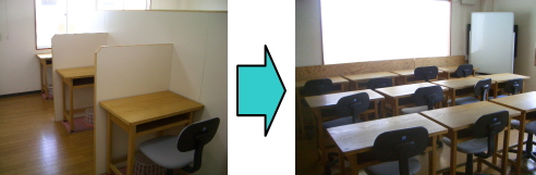 たとえば個別学習には定番のパーティション(※ふくろうの森が使用していたパーティションは職人の手作りによるものでした。)を取外し集団学習と同じような教室になっています。